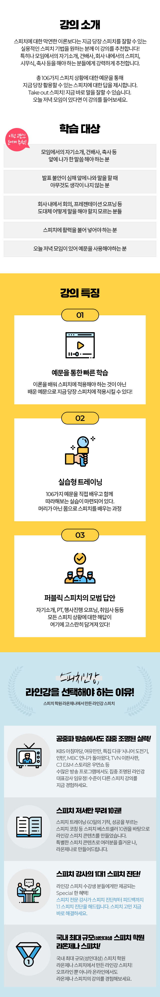 총 106가지 스피치 상황에 대한 예문을 통해 지금 당장 활용할 수 있는 스피치에 대한 답을 제시합니다. Take out 스피치! 지금 바로 말을 잘할 수 있습니다. 오늘 저녁 모임이 있다면 이 강의를 들어보세요.
